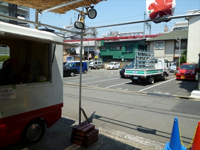駐車場のワゴン車と日除け、看板にベンチ、氷の文字・・・インパクトあるなあ