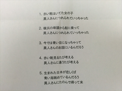 5番の歌詞。「赤い靴文化事業団」は遺族に許可を取って歌っているそうだ