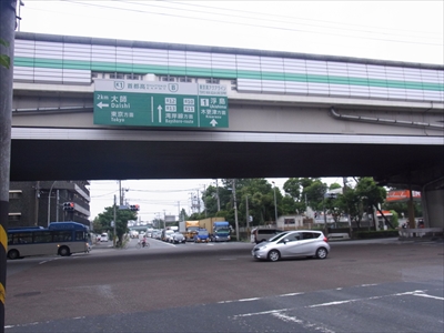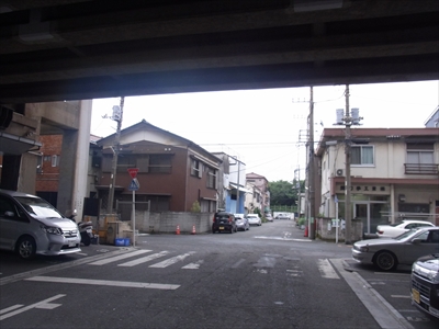 産業道路に近い場所には、高架に沿って幅の広い大きな道路がある。