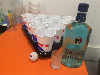 カウンターの端からカップに向けピンポン玉を投げ、競い合うゲーム。負けたほうが一杯呑むという罰ゲームをかけて夜な夜な勝負が繰り広げられるそうだ。