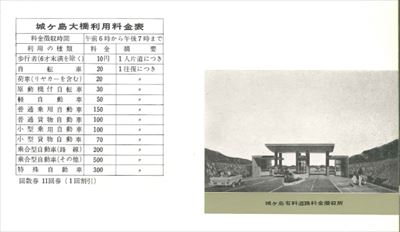 この大橋は一般の道路ではなく、あくまでも「漁港」のための施設なので、水産業や島民以外の人間や車両には通行料が課せられたという。開通当時は歩行者と自転車も通行料が必要だったが(しかも歩行者と自転車のみ片道料金!)1965(昭和40)年からは免除されている。料金設定の理由やいつまで通行料を取り続けるかについて、明記されている資料も、残念ながら見当らなかった。