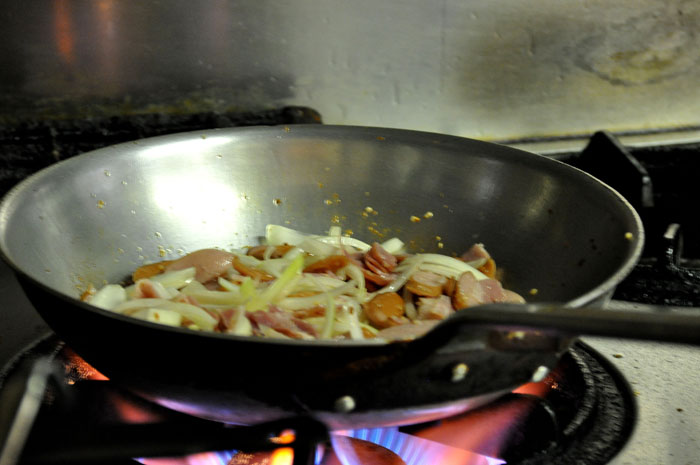 カンカンに温めたフライパンにオリーブオイルをたっぷりひき、ウインナー、ベーコン、えび、玉ねぎ、ズッキーニ、きのこなどの具を順に火を通す。