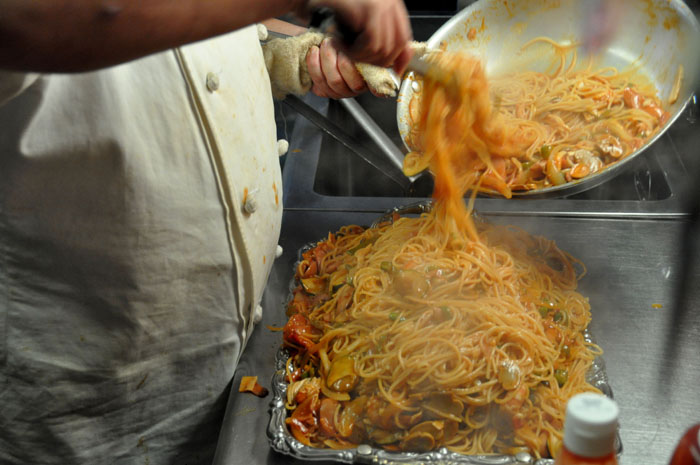 ケチャップなどで味付けをした具とパスタを絡め、ナポリタンはいよいよ盛り付けへ。