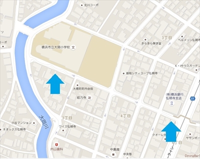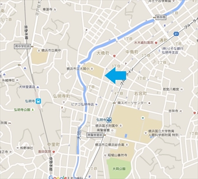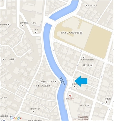 大岡小学校(青矢印)の隣りを流れる大岡川 (Googlemapより)