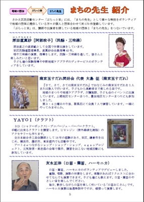 そんな話題の「口笛おじさん」にコンタクトを取りたいと思っていたところ、さかえ区民活動センターの情報誌『ぷらっと通信』に彼のことが載っていた。区民活動を支援する「ぷらっと栄」には、さまざまな特技を生かして老人ホームやケアプラザなどでボランティアを行う人たちが「まちの先生」として登録している。