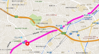 井土ヶ谷駅から最も近い、平戸桜木道路と交わる大きい交差点は地図中の赤丸印