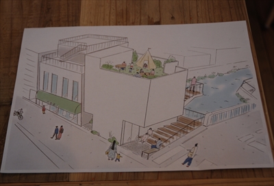 その後、土地のオーナーさんにも概ね承諾をもらい、約19坪の土地にビルを建て、1階をパン屋さん、2~3階を医療機関に、屋上を地域のイベントなどに活用できるスペースにしようという方向性が決まっていった。2016年12月着工、2017年8月オープンの予定で進めているという。