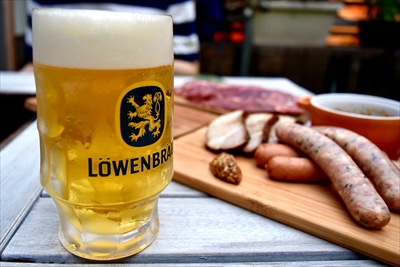 よだれで溺れかけたところへビールが到着。おお、レーベンブロイじゃないですか