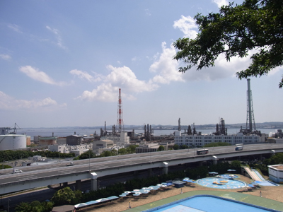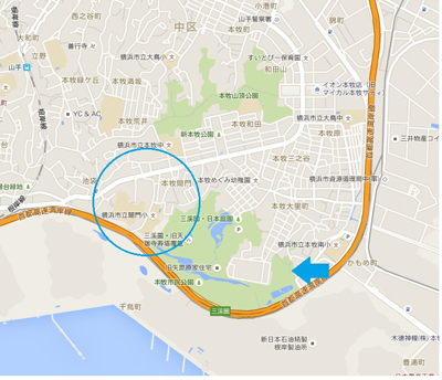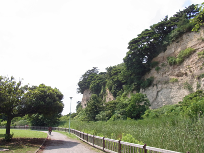 写真にあった崖に向かうと、崖の下は埋め立て地になっていて、本牧市民公園が広がっている。