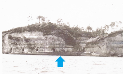 旧日本軍が作ったコンクリート製の波止場(青矢印)