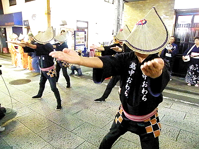夕闇が迫る18時。高尾会による「越中おわら節」が野毛柳通りを練り歩くと、それを合図とするかのように各出演者が街中へ散り、独自の芸を披露した。