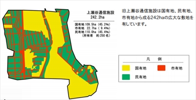 上瀬谷通信施設は現在、総面積約242ヘクタール(242万平方メートル、横浜スタジアム約92個分)をほぼ農地として使用しているが、跡地利用については国有地である約110ヘクタールを中心に、国際的な花の祭典「国際園芸博覧会(=花博)」の開催を検討。