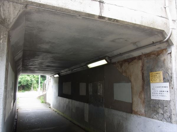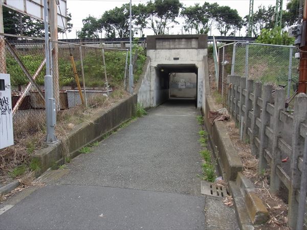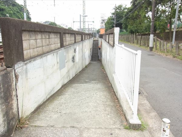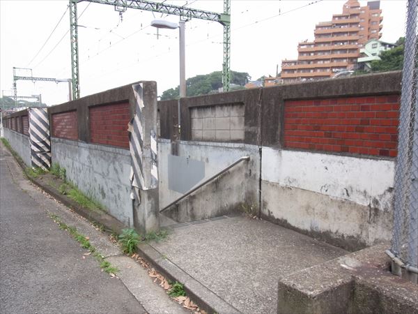 壁と壁の間はスロープと階段になっていて、その先は線路の下をくぐる地下道になっている。地下道の向こう側は国道16号線が走っていた。