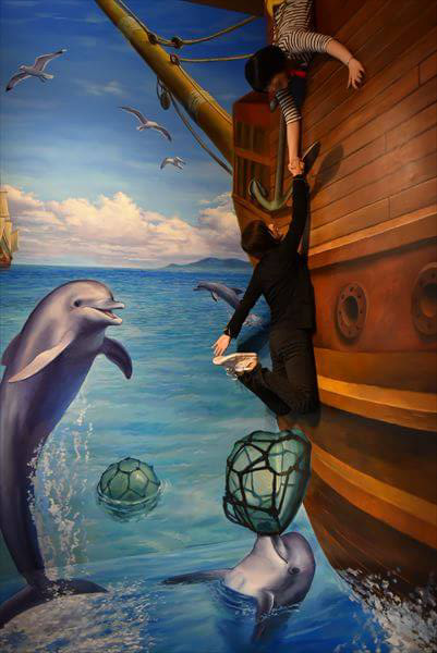 船から落ちそうな副編を、高村さんが助けようとしている! なるほど、これは縦に描いた絵じゃできない。遊び方がいろいろあるのが、トリックアートの面白さなんだな~。