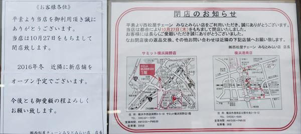 「現在はありません。閉店は残念です。16年間の営業をとおし、来ていただいたお客様には感謝の言葉しかありません。またみなとみらいにお店が出せる時が来るといいと思っています。今後は東神奈川店を利用していただきたいです」