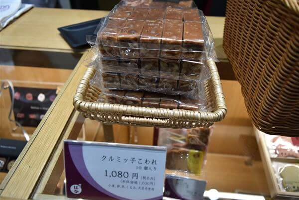 ほとんど、どこが欠陥なのか分からないくらいの商品だった。正規品の「クルミッ子」は1個140円だが、こわれは10個入りで1080円。ほとんど正規品と変わりないので、とってもお得だ。