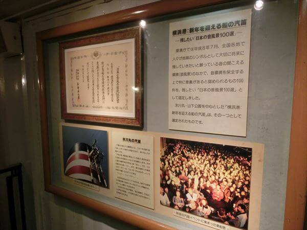 「横浜港新年を迎える船の汽笛」として「日本の音風景百選」のひとつに認定。氷川丸は代表をして、表彰を受けた。