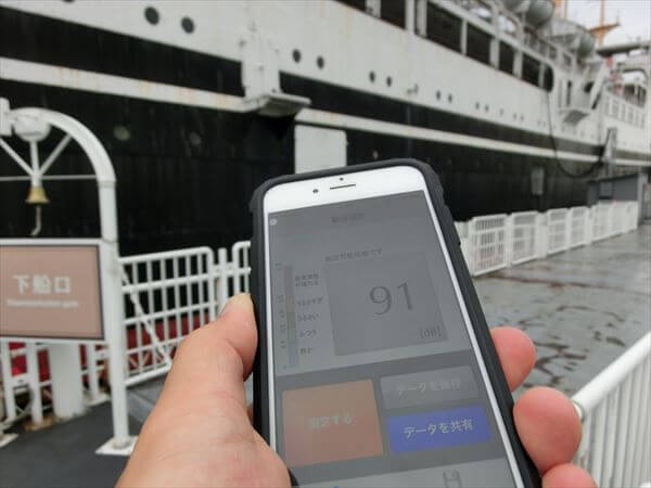 氷川丸の正午の汽笛の音を簡易的な騒音計アプリで計測 。結果は91デシベル