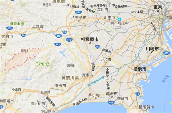 神奈川県丹沢山地のふもとにある道志村(Googlemapより)
