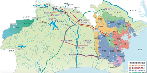 横浜の水源は、道志川・相模湖・馬入川・企業団酒匂川・企業団相模川と5系統。合わせて1日当たり195万5700立法メートルのうち、道志川系統からは17万2800立法メートルをまかなっている。