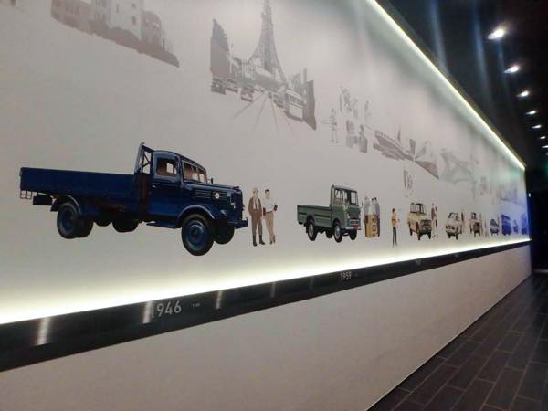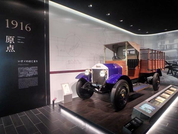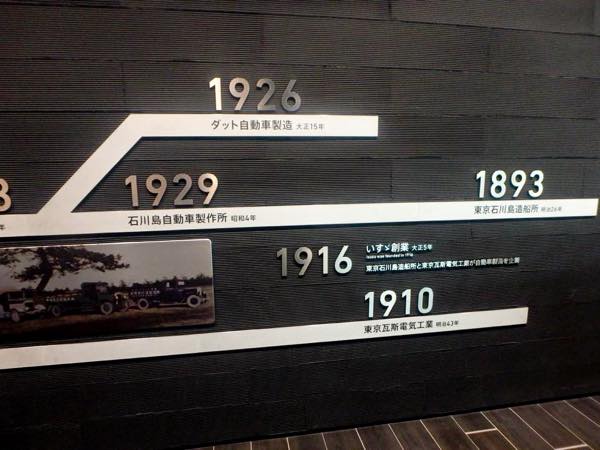 奥へと続く通路には、いすゞの歴史が壁に展示されている。同社の創業は1916(大正5)年。実は国内に現存する自動車メーカーの中で最古の歴史を誇っているのだ。