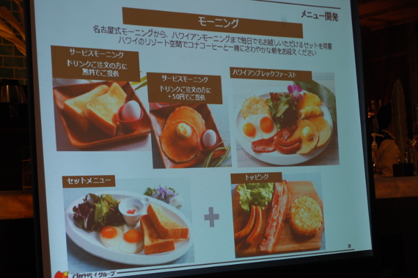 モーニングはハワイのゆったりとした朝食をイメージしており、コナコーヒー(400円・税別)を注文すると、2枚のトーストが付いてくる“名古屋式”というのがユニークだ。もちろん、そのほか、目玉焼きやソーセージ、パンケーキといった「ハワイアンブレックファースト」も堪能できる。