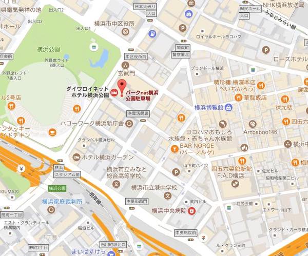 ダイワロイネットホテル横浜公園に併設している駐車場。営業時間は24時間。料金は全日30分150円。入庫から12時間まで最大料金1500円。