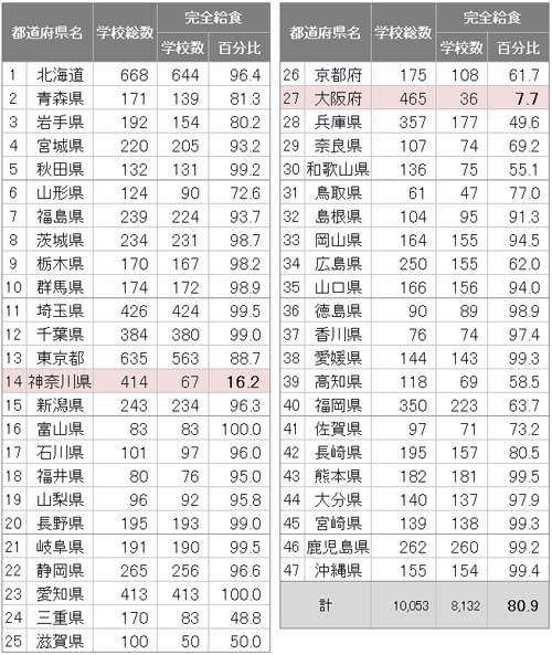 さらに、神奈川県内の市町村を調べると、横浜市、川崎市、横須賀市など大半の市町で完全給食実施率0%であることが分かった。完全給食実施率99.5%の埼玉県で育った筆者にとっては、給食がない「中学生が毎日弁当を持参する」光景は想像すらできなかった。