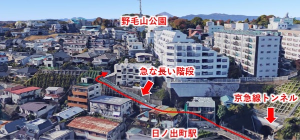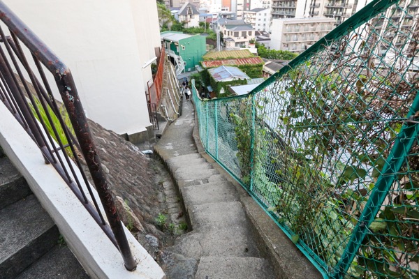 京急線をまたぐ陸橋が駅の横にあり、そこを渡ると、すぐに長い階段の登り口に着いた。