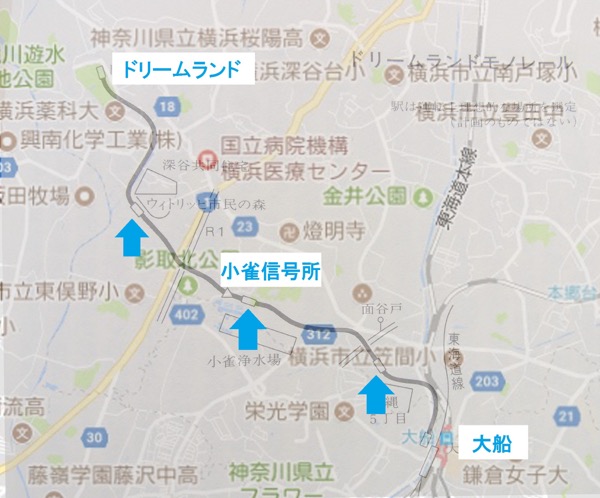 大船駅とドリームランド駅。駅が出来る予定だった場所(青矢印、Googlemapより)