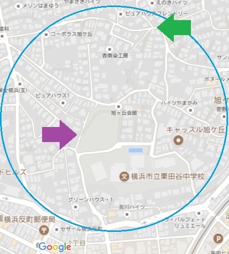 「こうもり山」があった場所(青矢印、Googlemapより)