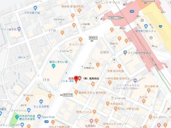 尾島商店はJR「桜木町」駅から徒歩4分ほど(google mapより)
