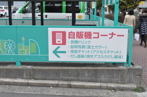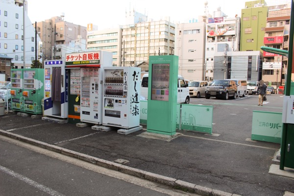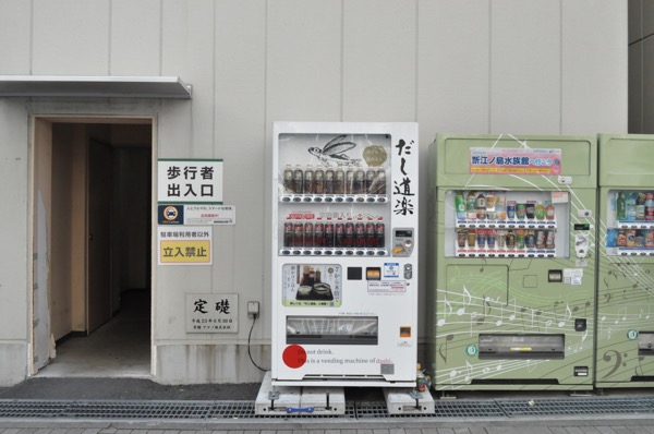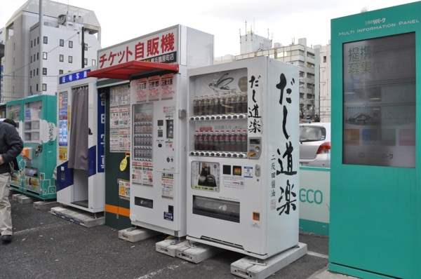 ちょっと変わった販売機が並び、写真右側には「だし」の文字が見える