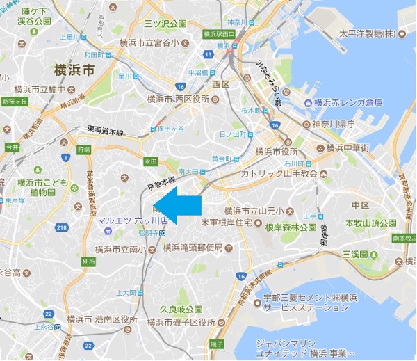 投稿の「みどりの丘」(青矢印、Googlemapより)