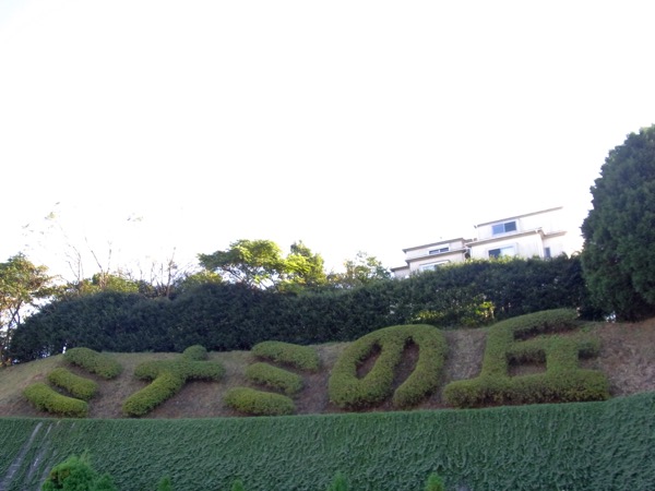 早速弘明寺駅から井土ヶ谷駅に向かって京急本線に乗ってみると、弘明寺駅近くで進行方向右側の車窓から見える山の頂上付近に、「ミナミの丘」という文字の刈り込みが作られた山を発見。