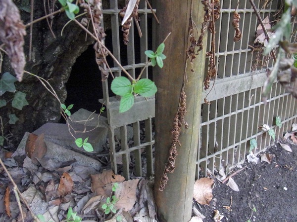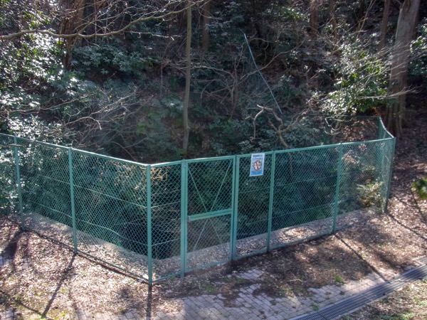 散策路を逸れ、北側に建ち並ぶマンションの方に下りると川名森久第二公園が広がっている。その公園と新林公園の境目の山際に柵のされた場所を発見した。柵の内側は池のように見えるが、山側に穴が開いている。これが投稿にあった柵のされた場所だろうか。