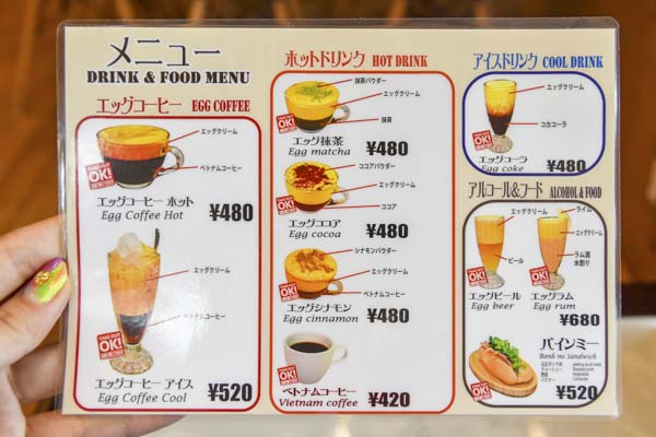エッグコーラもキニナルが、今回はエッグコーヒーを選択。店員さんから「今日は暑いですので、アイスの方がおすすめです」とのアドバイスをいただいたので、冷たいエッグコーヒーをいただくことに。