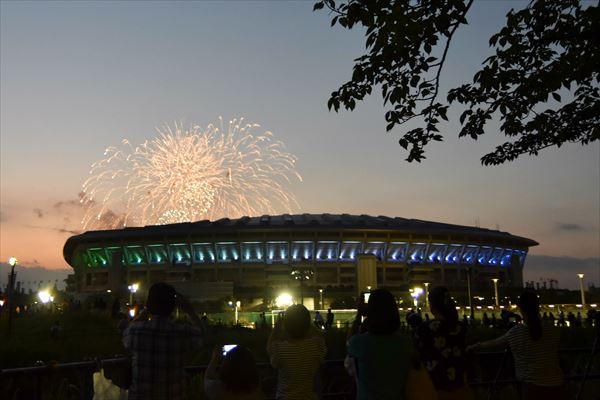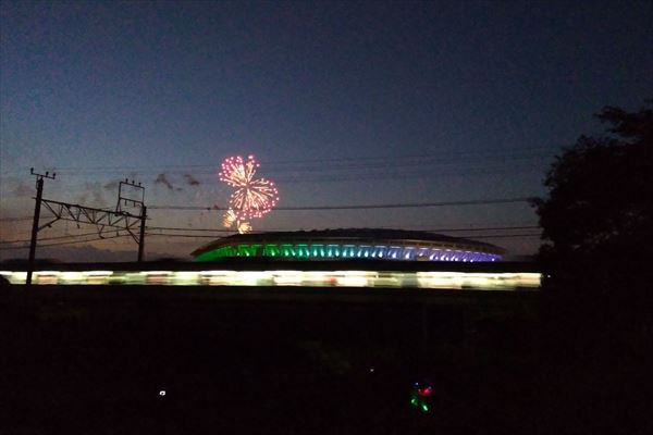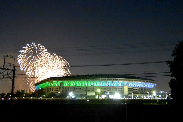 日産スタジアムと花火のコラボレーションだ。事前の取材では日産スタジアムがライトアップするかどうかは未定だったが、日産スタジアムの粋な計らいが花火をより美しく演出する。