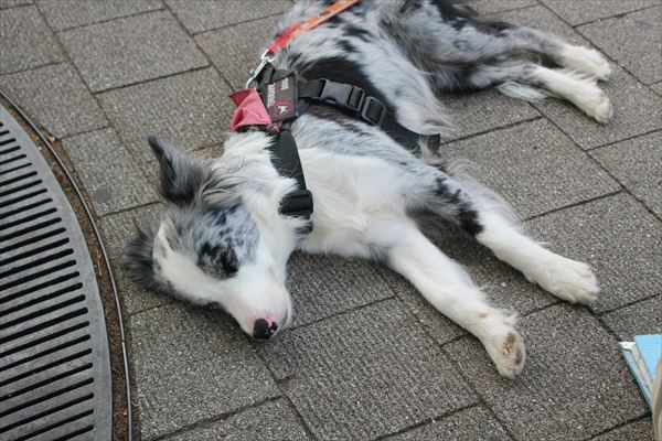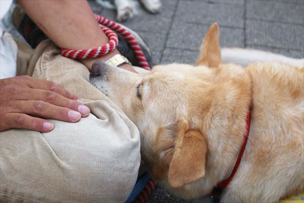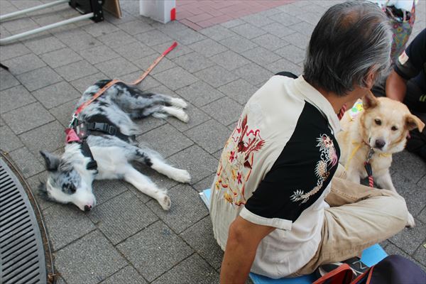 犬の横に座っている男性に、「そこで横たわっているワンちゃん、体調は大丈夫なんですか?」と声をかけると、「はい、大丈夫ですよ。ああやって寝転んでいるのは、暑くてバテているのではなくリラックスしている様子なんです」と男性。