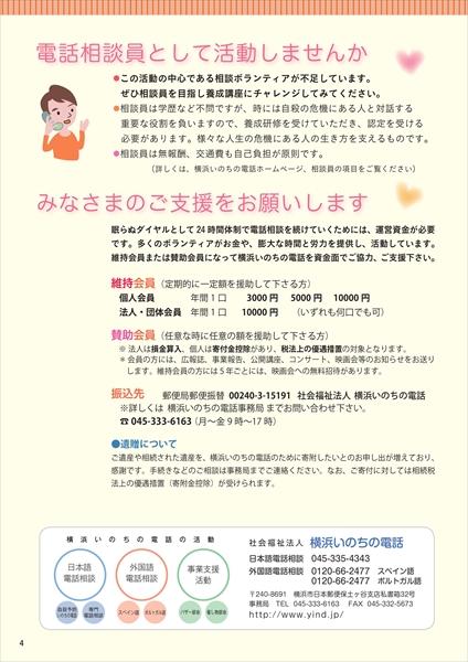 横浜いのちの電話では、「養成研修費用」の引き下げを検討中。ボランティア相談員の負担の大きさと役割の重さ、減少する若者からの相談対応などに頭を悩ませながら、24時間対応の活動を行っている