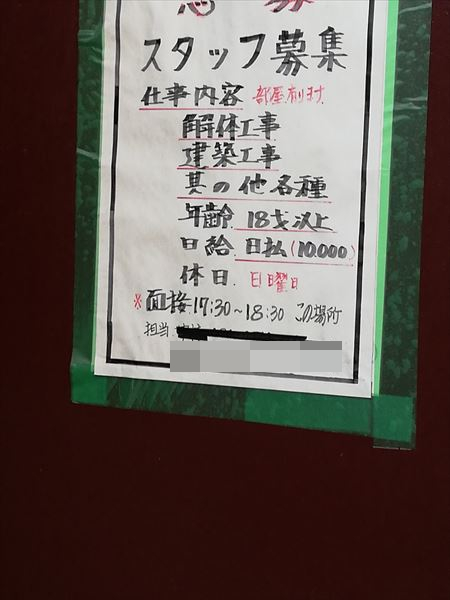 そんな中、一軒のドヤの入り口でこんな張り紙を見かけた。なんと直接面接をしているらしい。対面なので他の求人よりも怖くはない。「ここでなら働けるかもしれない」そんな思いが私の脳裏をよぎった。