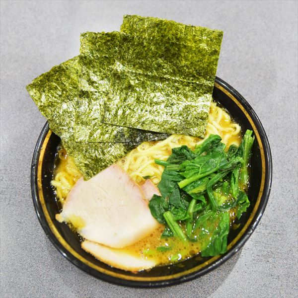とんこつと鶏ガラをベースにしたコク深い醤油スープ、酒井製麺の極太麺、鶏油、チャーシュー、ほうれん草、海苔をトッピングした家系ラーメン王道の姿を作り上げた。