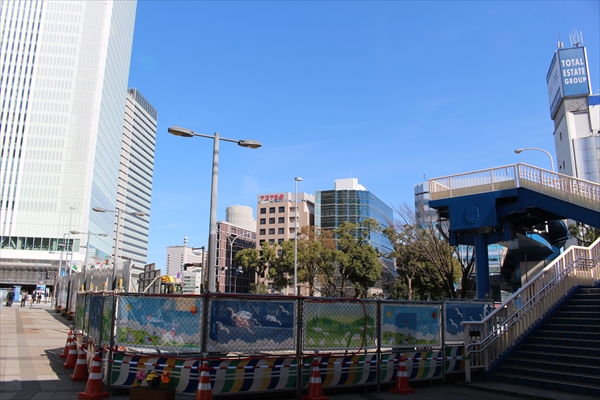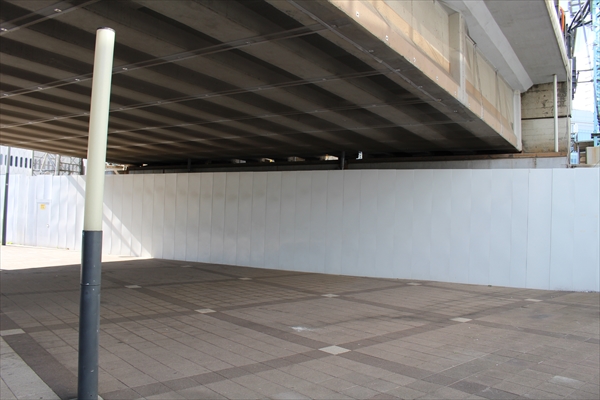 かつてはファミレスなどの飲食店が並んでいた駅南側の高架下周辺は、工事用の仮囲いに覆われていた。