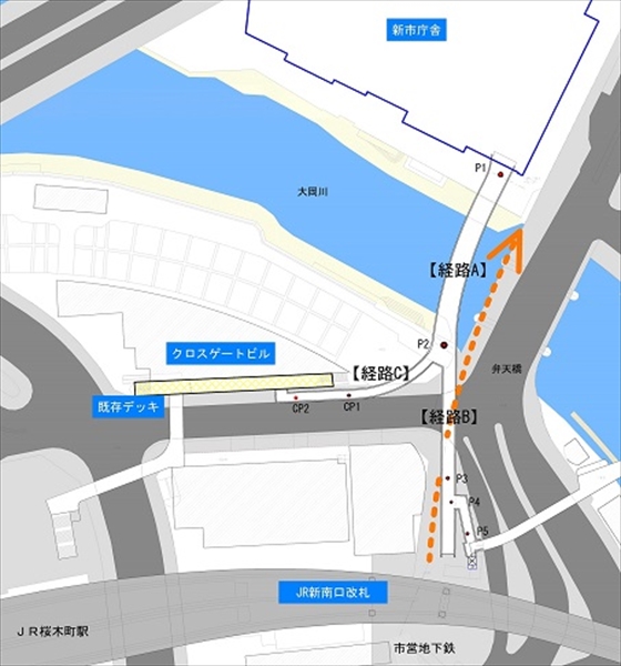 「(仮称)大岡川横断人道橋」は、新改札すぐの横浜桜木郵便局前とクロスゲートビルから、大岡川対岸の新庁舎までを結ぶ歩道橋。これまでは信号を待って通りを横断し、辨天橋(べんてんばし)を通って向かう必要があったが、これを使えば新庁舎までの道のりがスムーズになるというわけだ。