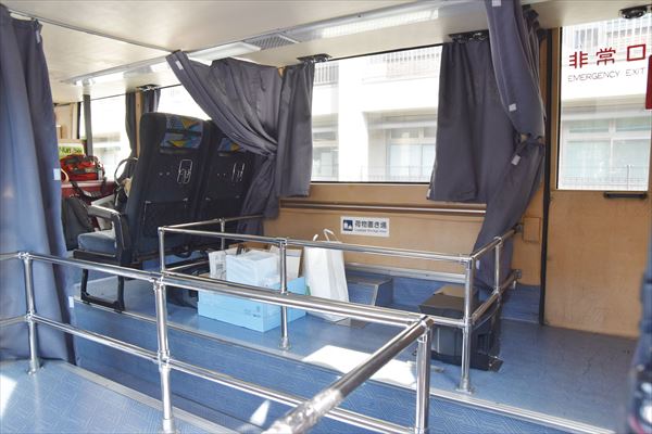 座席は2階席のみで1階は大きな荷物を預ける荷物置場となっている。またバリアフリー対応ではないため、車椅子に乗ったままの利用はできない。現状は車椅子を荷物置場に預け、座席まで移動する利用方法となる(介助する方も乗車料金が必要)。