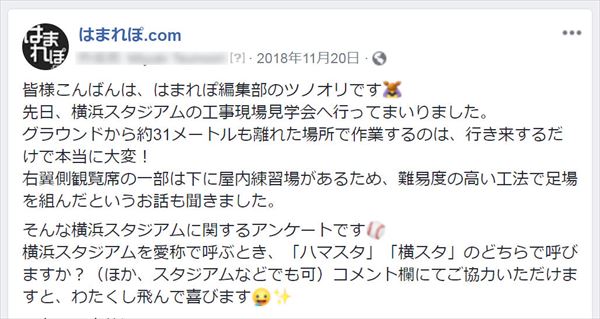 調査方法はいたってシンプル。いろんな場所でいろんな人に「横浜スタジアムの略称・愛称」を聞いてみることに。まずは、2018(平成30)年11月にFacebookでアンケート。