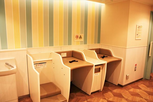 おむつ交換台は3台。バックや小物を置けるスペース(棚)があるのも嬉しいポイント。窮屈な空間で行うおむつ交換ほど、やりにくいものはないのだ。
