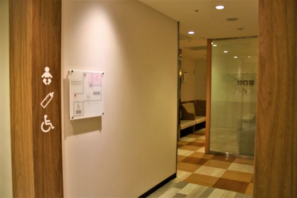 第1エスカレーターとエレベーターのすぐ側にベビー休憩室はある。通路は少し狭いように感じるが、双子用のベビーカーのような幅広タイプでない限り、問題ないだろう。