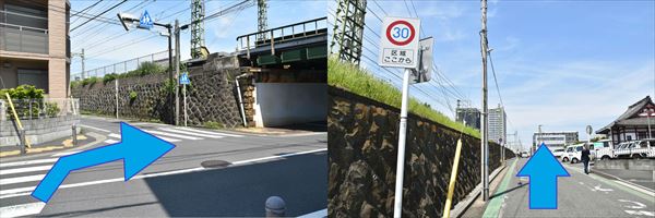 傾いた家のその後を撮影し、信号を渡らない旅を再開。横断歩道を渡って京急線の高架下をくぐり、線路沿いを直進する。