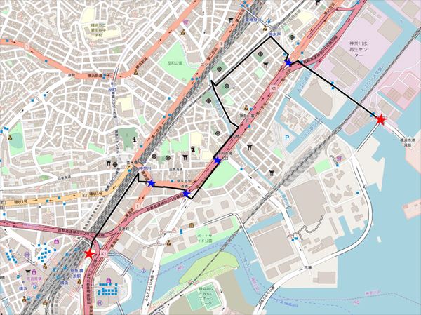 横浜駅から瑞穂大橋まで信号を渡らずに歩く経路はこちら。
